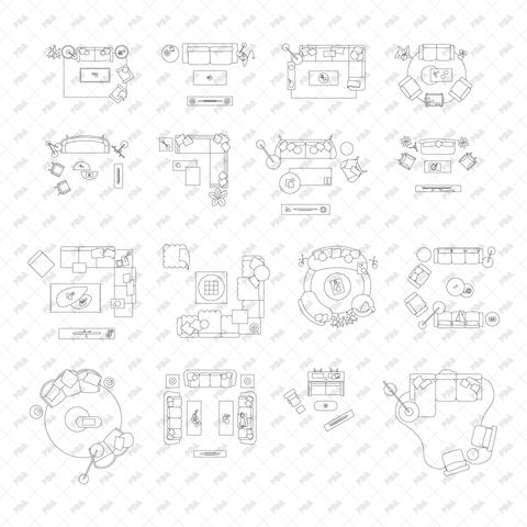 Description: CAD, vector, PNG set of line art drawings of various living room layouts, all viewed from above (top view). Perfect for your 2D architectural plans, diagrams, post-digital drawings, collages, and visualizations.