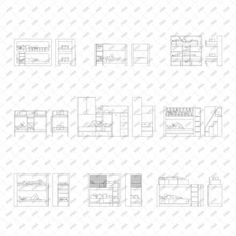 Description: Set of CAD, Vector, and PNG line-art drawings of modern bunk beds in front and side view. Ideal for sections, elevations, collages and other architectural documents.