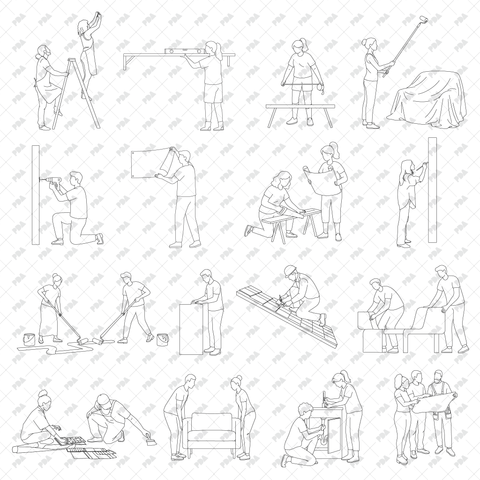 Description: A set of CAD, vector, and PNG line-art drawings of people engaged in home renovation activities, shown in both front and side views. The set includes a wide variety of actions such as measuring walls, drawing plans, demolishing partitions, laying tiles, installing flooring, painting walls, plastering, moving furniture, installing a kitchen, handling tools and materials. Perfect for sections, elevations, exploded diagrams, collages, and other architectural documents.